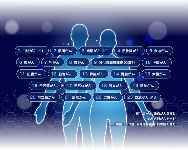 23種類 口腔/咽頭/喉頭/甲状腺/食道/肺/乳/胃/肝臓/胆嚢/胆管/膵臓/腎臓/大腸/子宮頸・体部/卵巣/精巣/前立腺/膀胱/皮膚/血液/消化管間質腫瘍 |